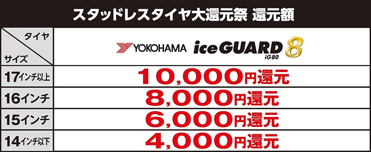 購入するスタッドレスタイヤ4本セットの税込価格から還元します。17インチ以上/16インチ/15インチ/14インチ以下の4本セット購入で還元額が異なります。